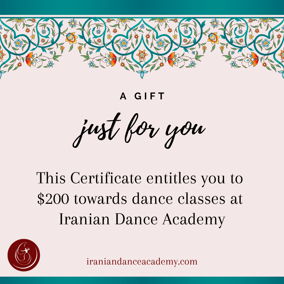 The gift of dance shows your love for someone in a way nothing else can. Your special someone can apply this gift certificate towards any class or product on the Iranian Dance Academy website. They will be overjoyed knowing they will have the opportunity to nourish their mind, body and soul with the beautiful experience of Persian-Iranian dance.